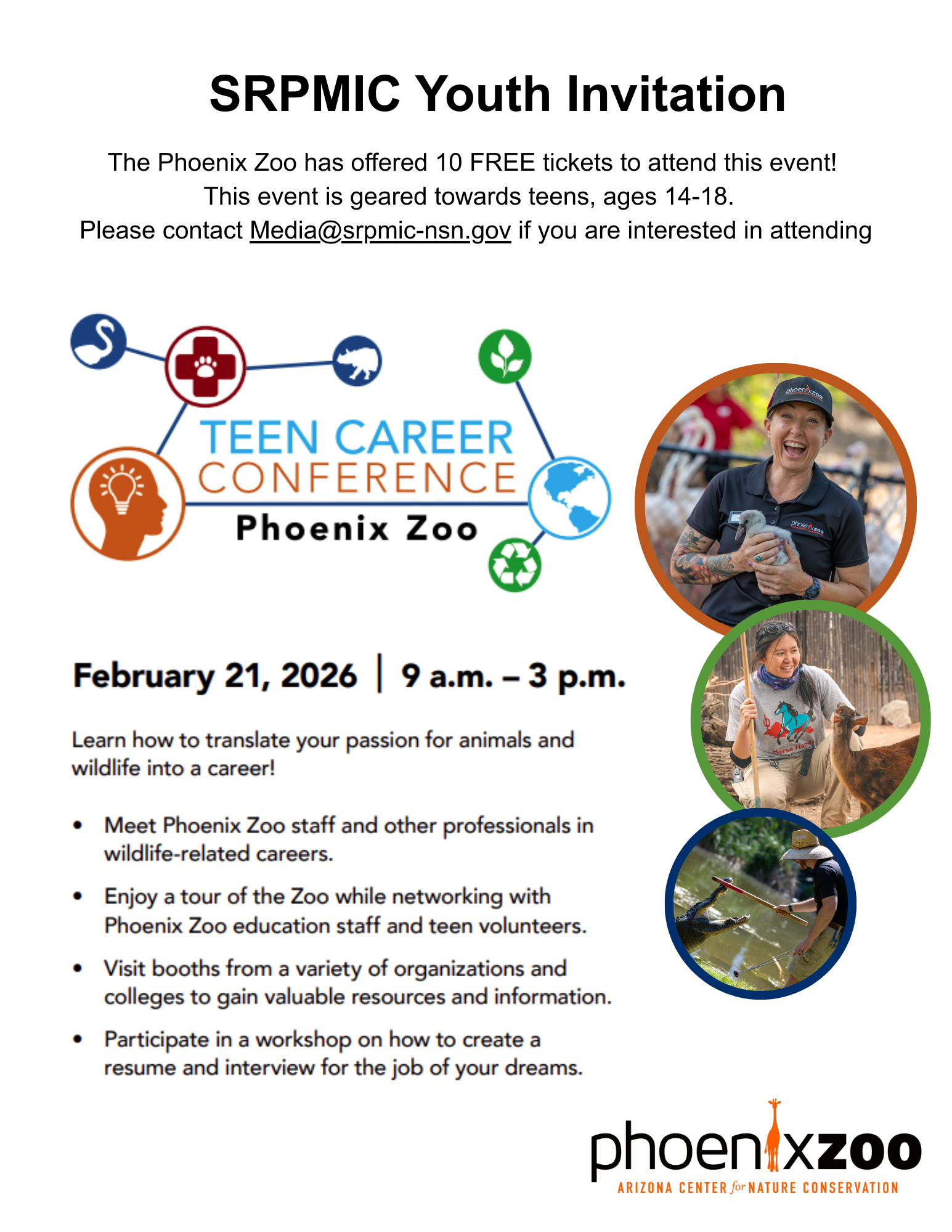 The Phoenix Zoo has offered 10 FREE tickets for SRPMIC teens to attend their Teen Career Conference!