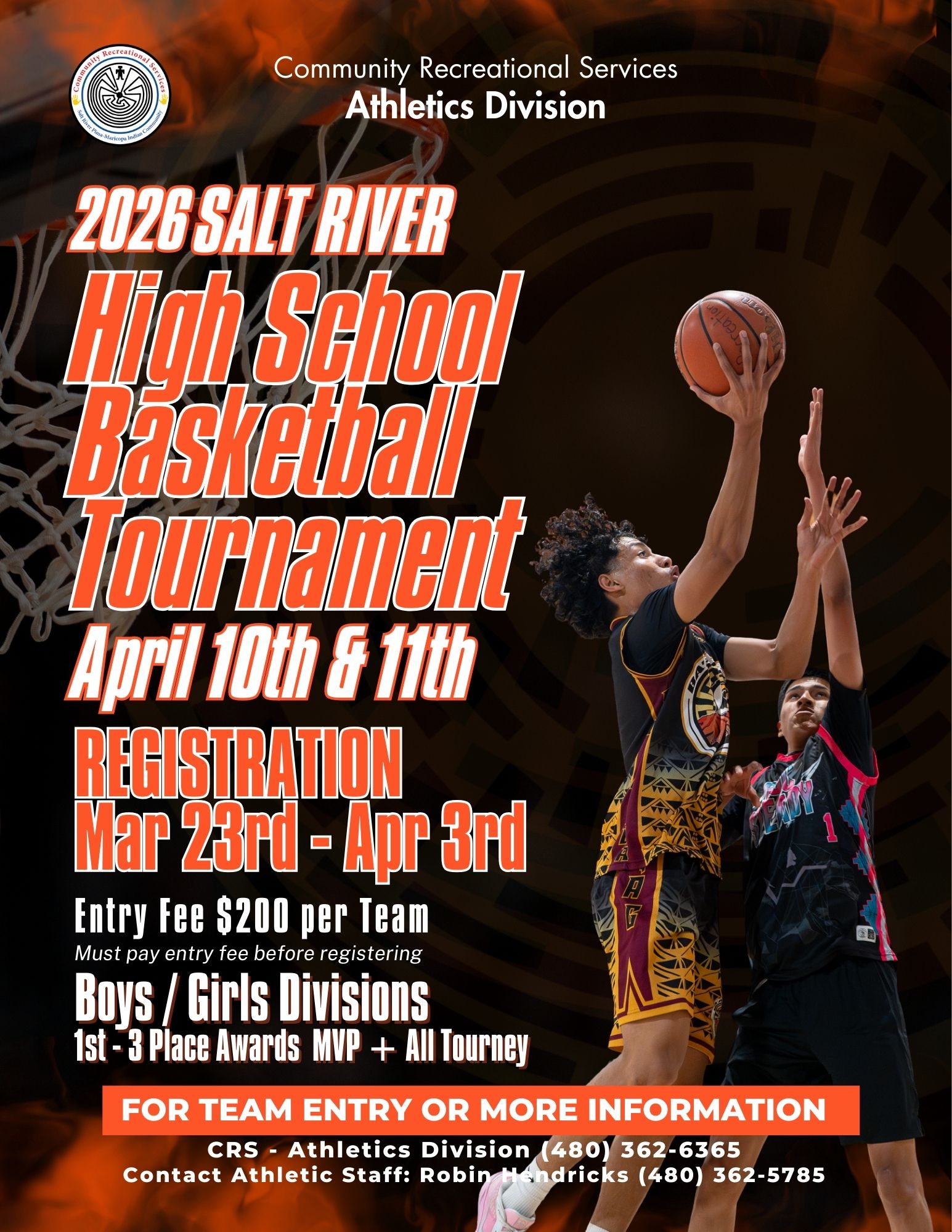 Community Recreational Services Athletics 2026 Salt River High School Basketball Tournament is returning to Ske:g Himdag Ki: Courts and we’re looking for teams ready to compete for the title. Grab your squad, build your roster, and get ready to battle it out on the court.