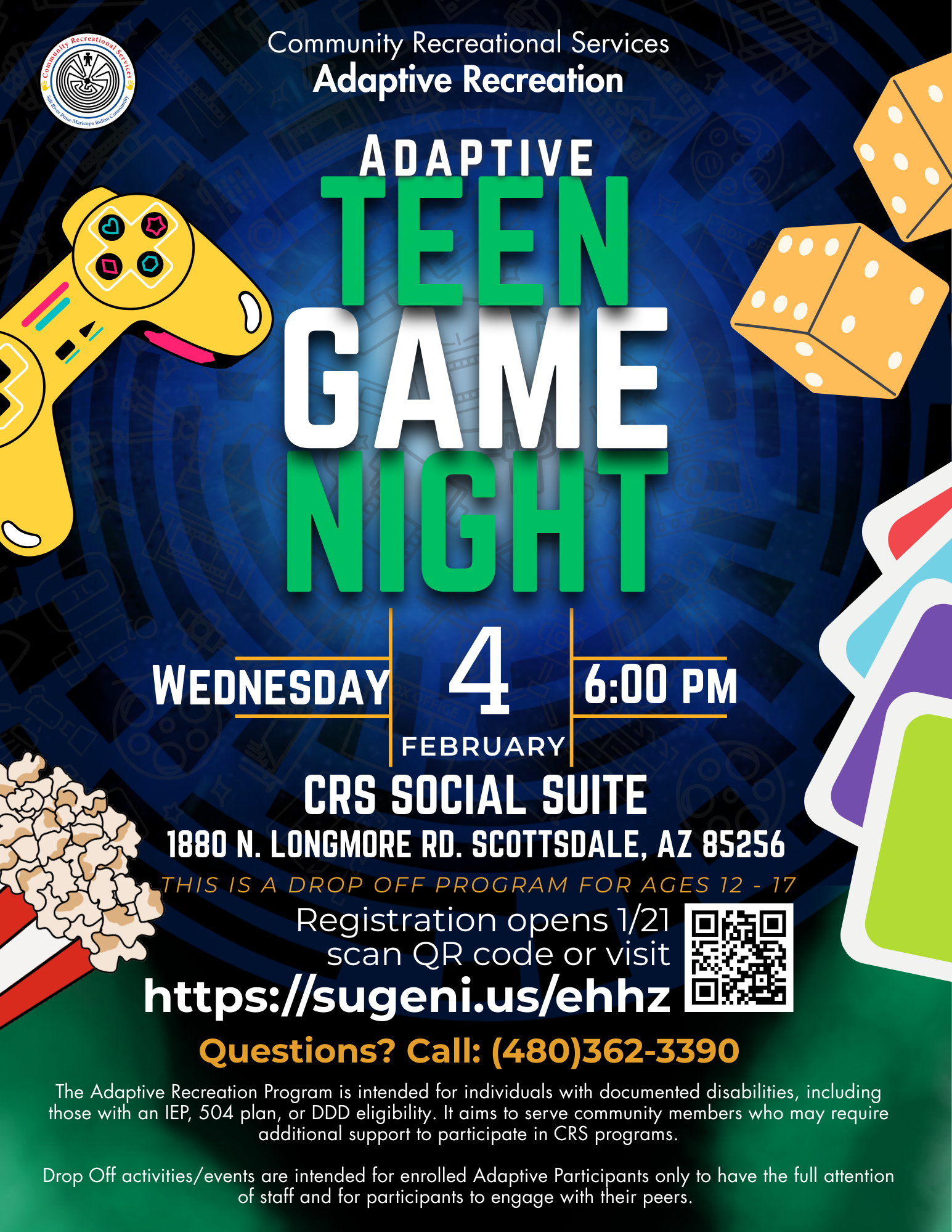 Community Recreational Services Adaptive Recreation Team invites community teens, ages 12 – 17, to join us for a drop-off Teen Game Night!
