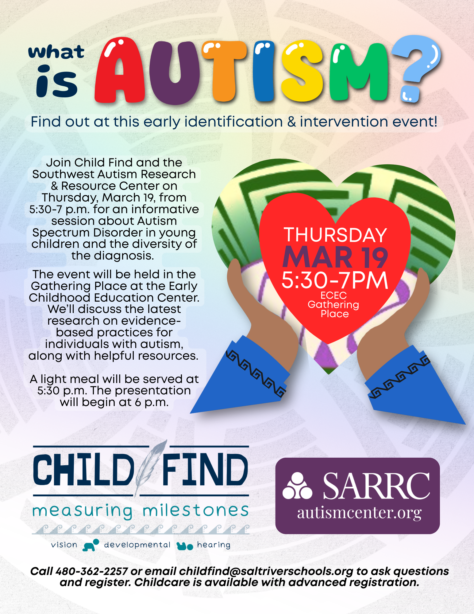 Call 480-362-2257 or email childfind@saltriverschools.org to ask questions and register. Childcare is available with advanced registration.