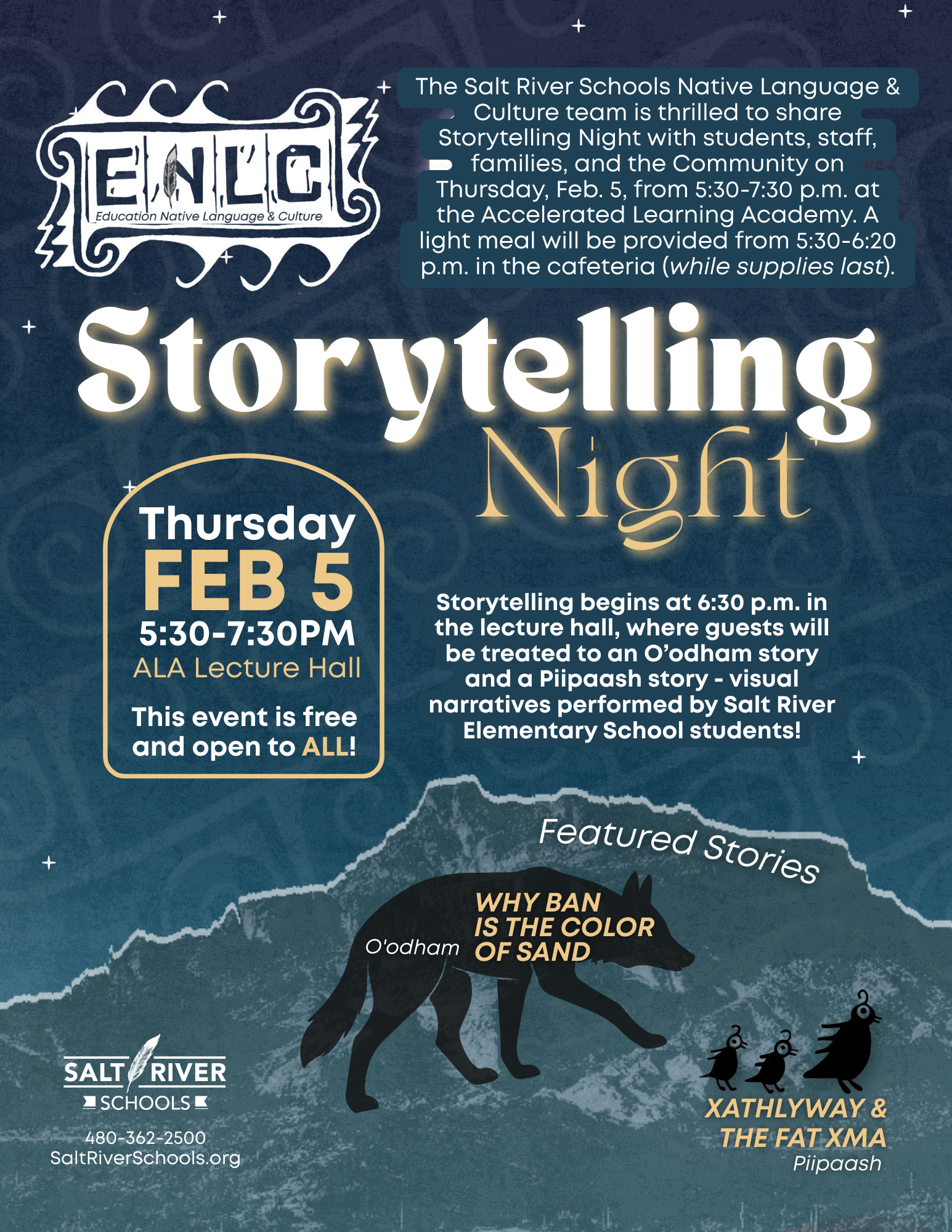 The Education Native Language & Culture team is thrilled to share Storytelling Night with students, staff, families, & the Community on Thursday, Feb. 5, from 5:30-7:30 p.m. at the ALA.
