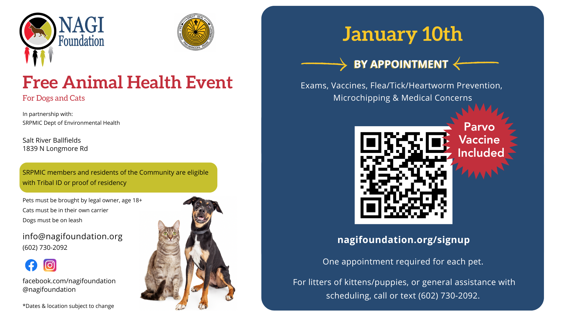SRPMIC members and residents can bring their pets for free exams, vaccines, flea/tick treatment, microchipping, heartworm prevention, health screenings, and medical concerns.