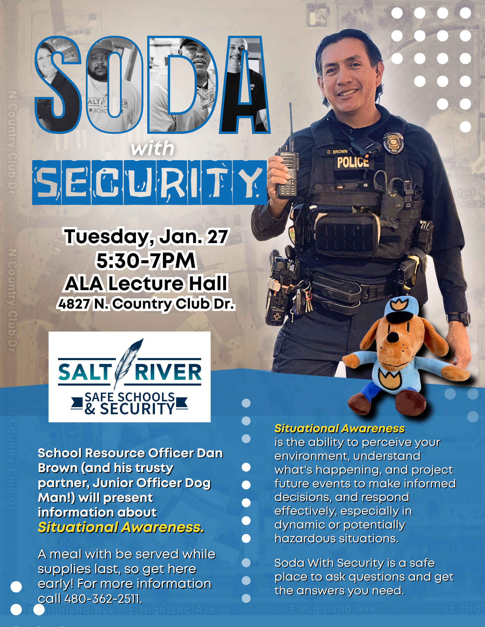School Resource Officer Dan Brown (and his trusty partner, Junior Officer Dog Man!) will present information about Situational Awareness. This informative session will be held on Tuesday, Jan. 27, from 5:30-7PM at the ALA Lecture Hall.