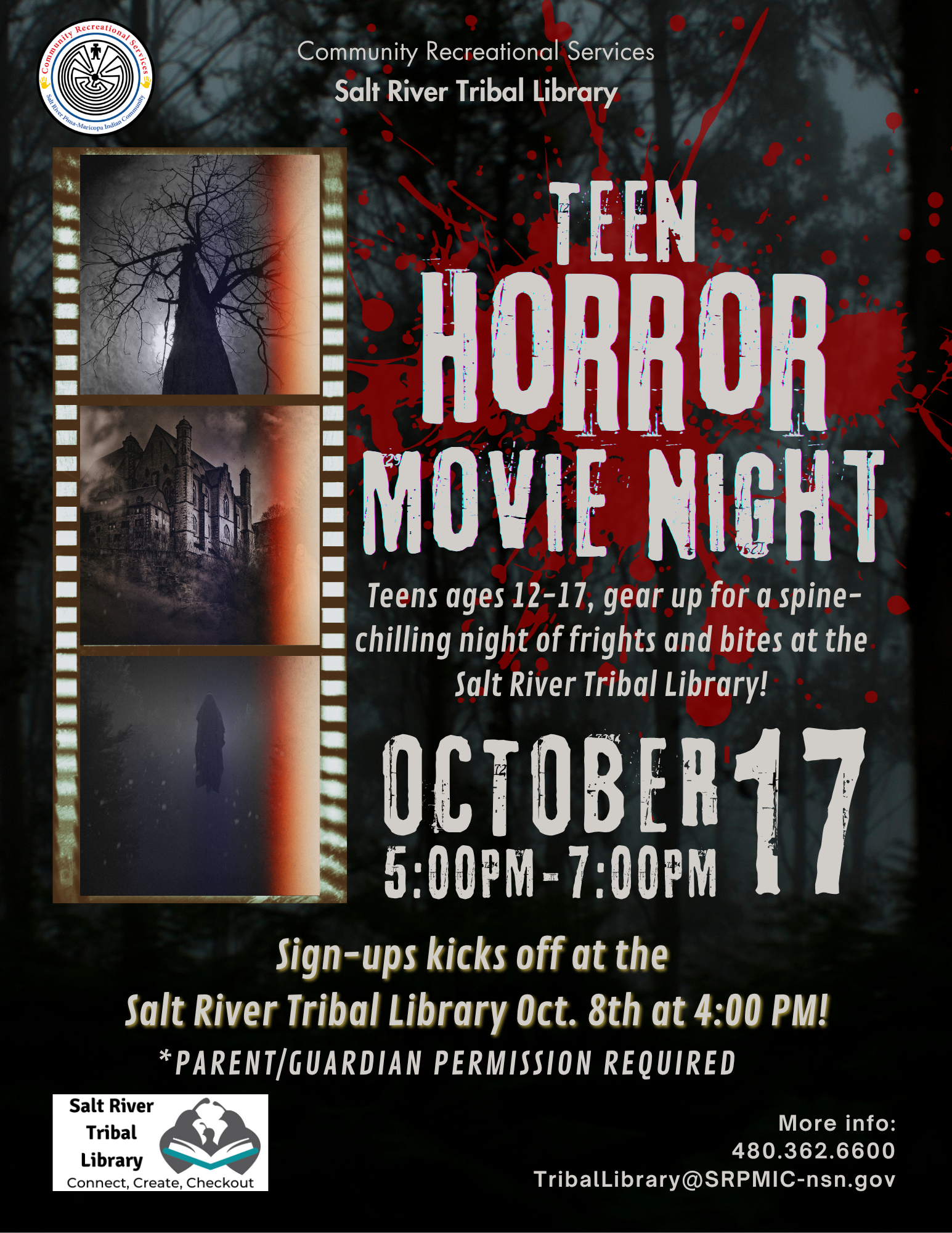 Join Community Recreational Services and the Salt River Tribal Library for a thrilling evening full of spooky surprises on Thursday, October 17, 2025, at 5:00 PM!