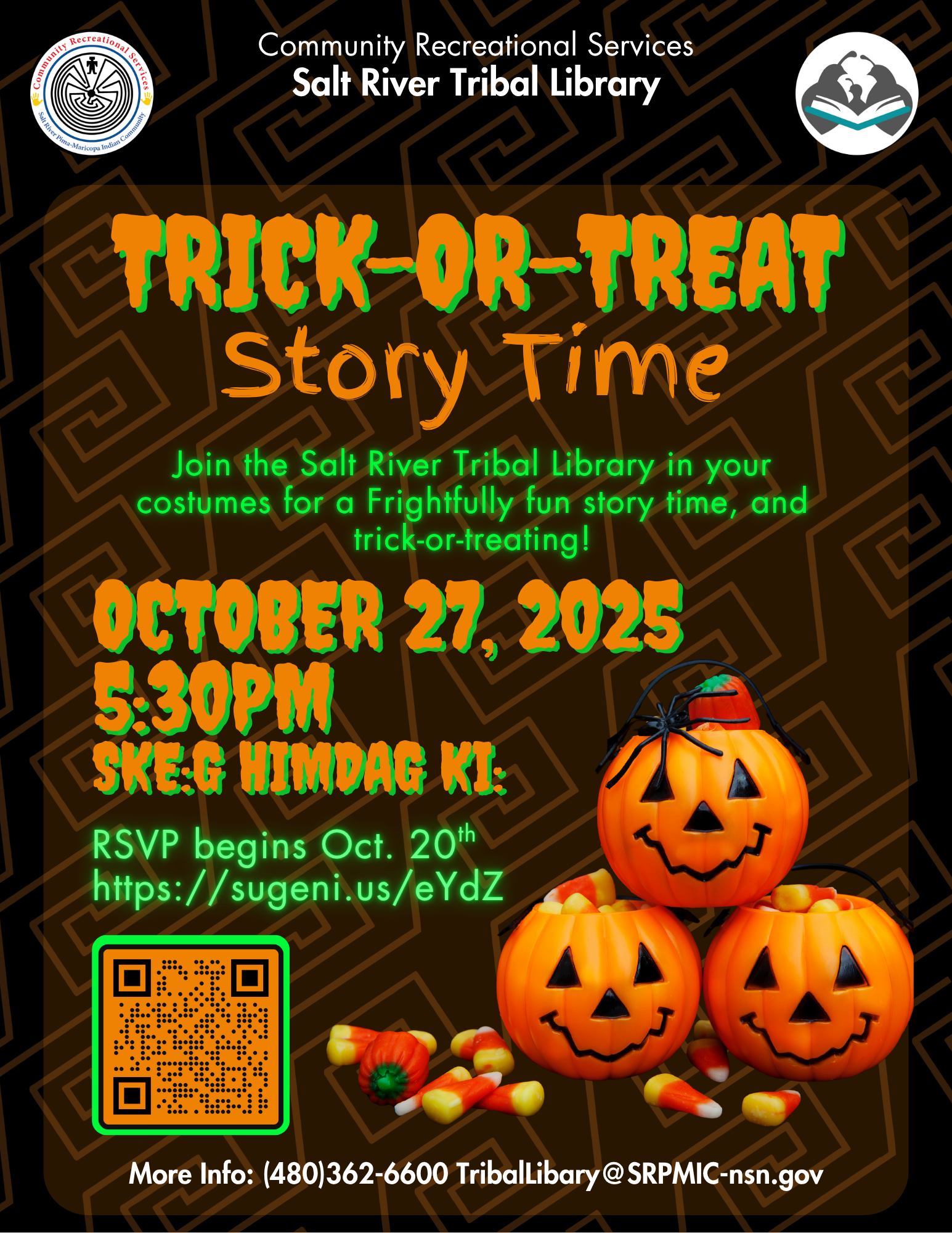 Join the Salt River Tribal Library on Monday, October 27, 2025, starting at 5:30 PM for a frightfully fun evening of stories and trick-or-treating throughout Ske:g Himdag Ki: