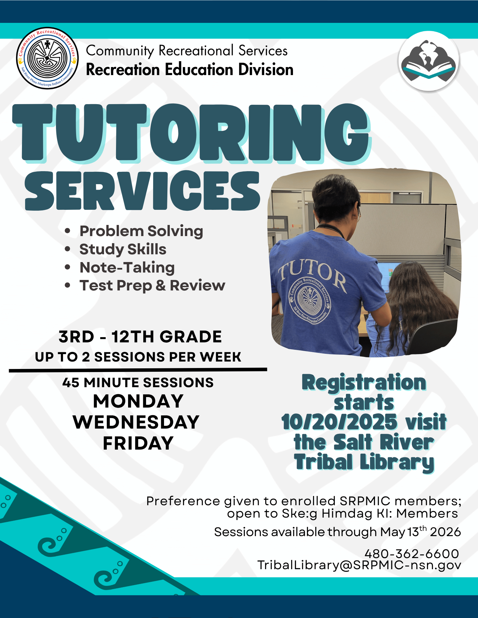 Join Community Recreational Services, Recreation Education for Tutoring Services at the Salt River Tribal Library! Learn tips for problem-solving, note-taking, study skills, and test prep to help you succeed.