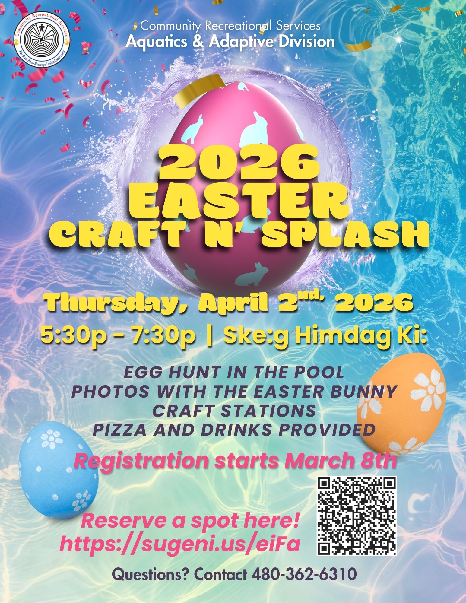Join Community Recreational Services at the Ske:g Himdag Ki: Pool for an evening filled with fun, creativity, and community. Families will enjoy festive crafts, a special appearance by the Easter Bunny, and an exciting egg hunt experience, poolside style!