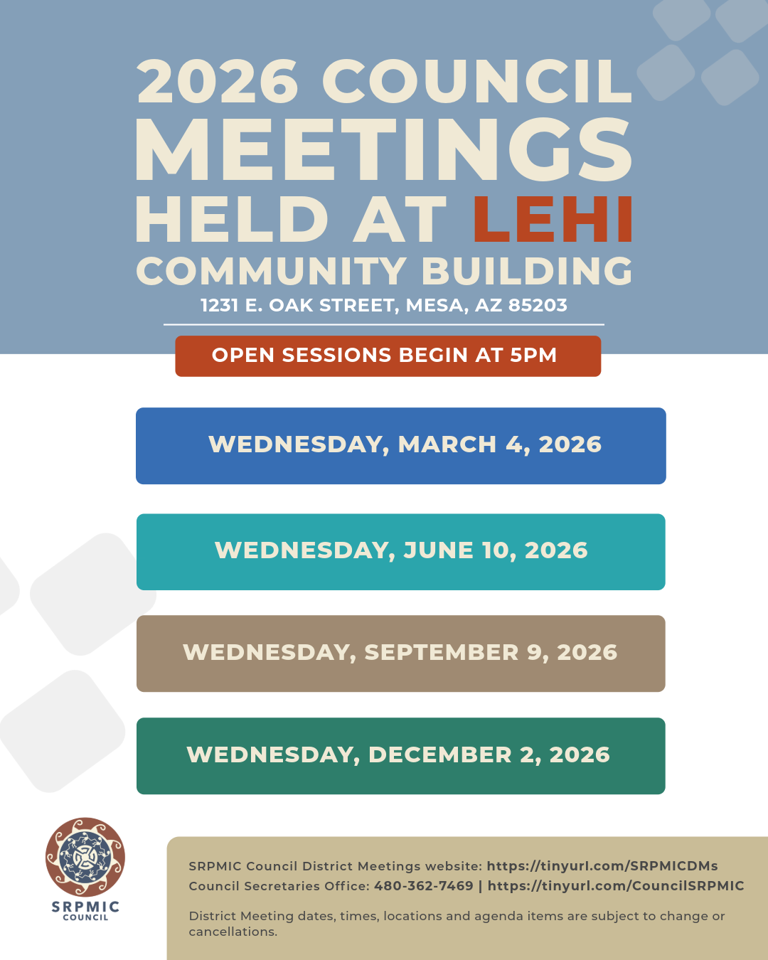 For updates, visit the SRPMIC Council Meetings website: https://srpmic-nsn.gov/government/council/councilmeetings/ or contact the Council Secretaries Office at 480-362-7469.