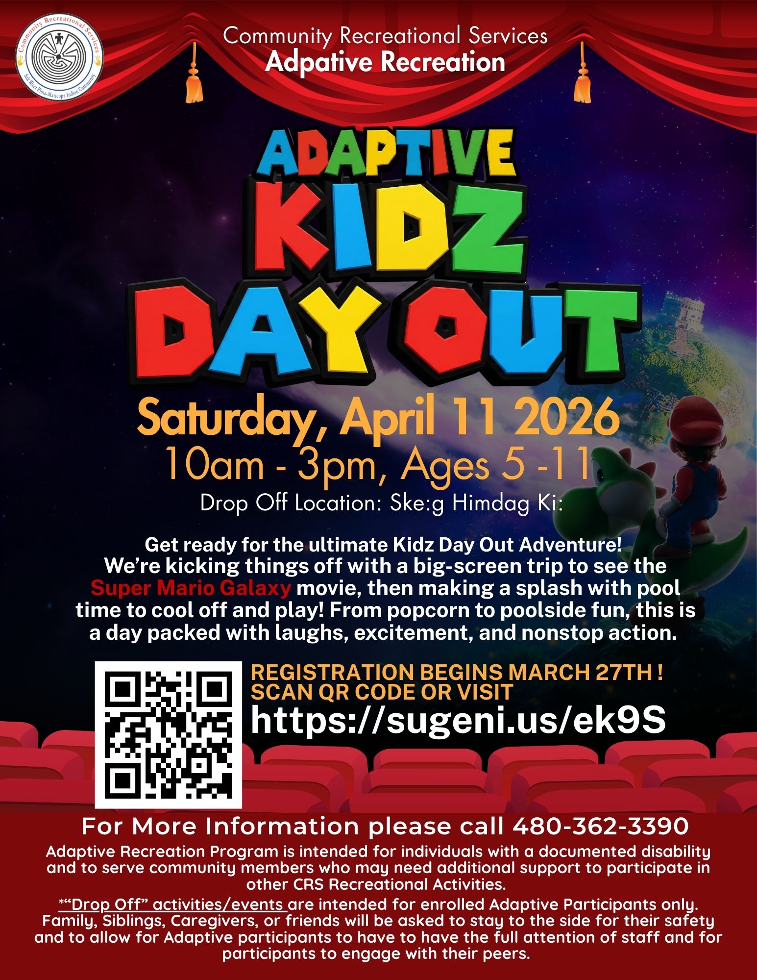 Community Recreational Services Adaptive Recreation is kicking off the day with a big-screen movie trip to watch Super Mario Galaxy, followed by pool time to splash, cool off, and play with friends. From popcorn and laughs during the movie to poolside fun, this action-packed day is full of adventure your kids won’t want to miss!