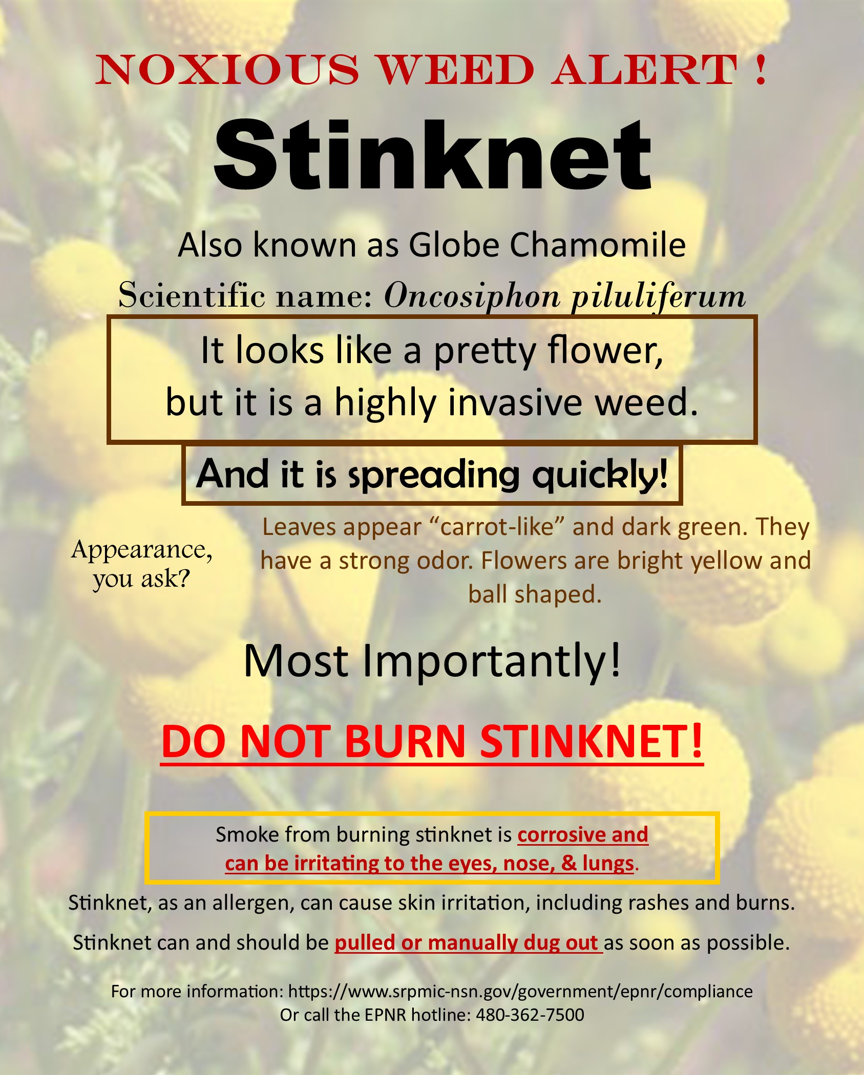 Stinknet (also known as Globe Chamomile) is a highly invasive weed that is spreading quickly.