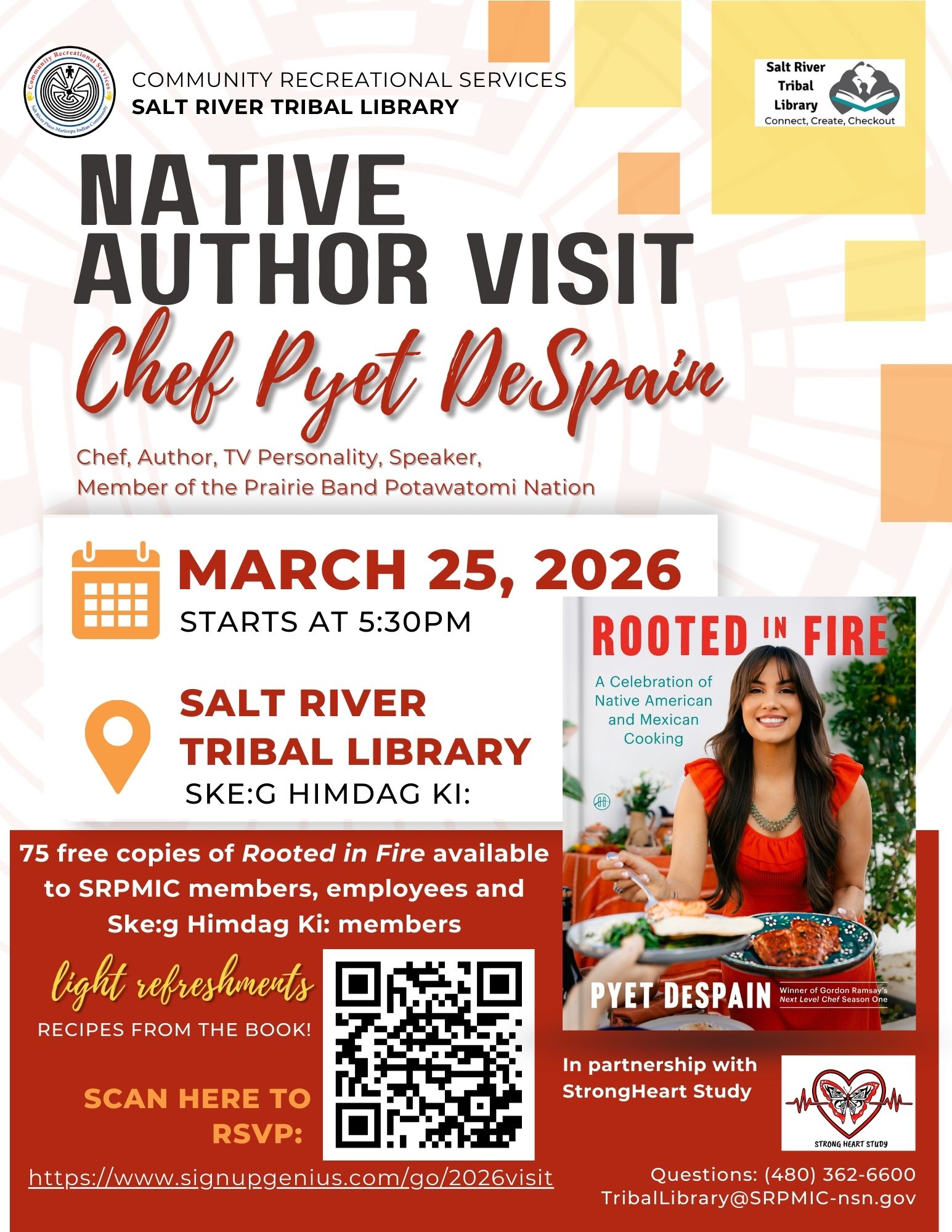 Meet Pyet DeSpain and celebrate Indigenous cuisine and culture. The first 75 attendees will receive a free copy of Rooted in Fire, available to SRPMIC members, employees, and Ske:g Himdag Ki: members. Guests will also enjoy light refreshments inspired by recipes from the book.