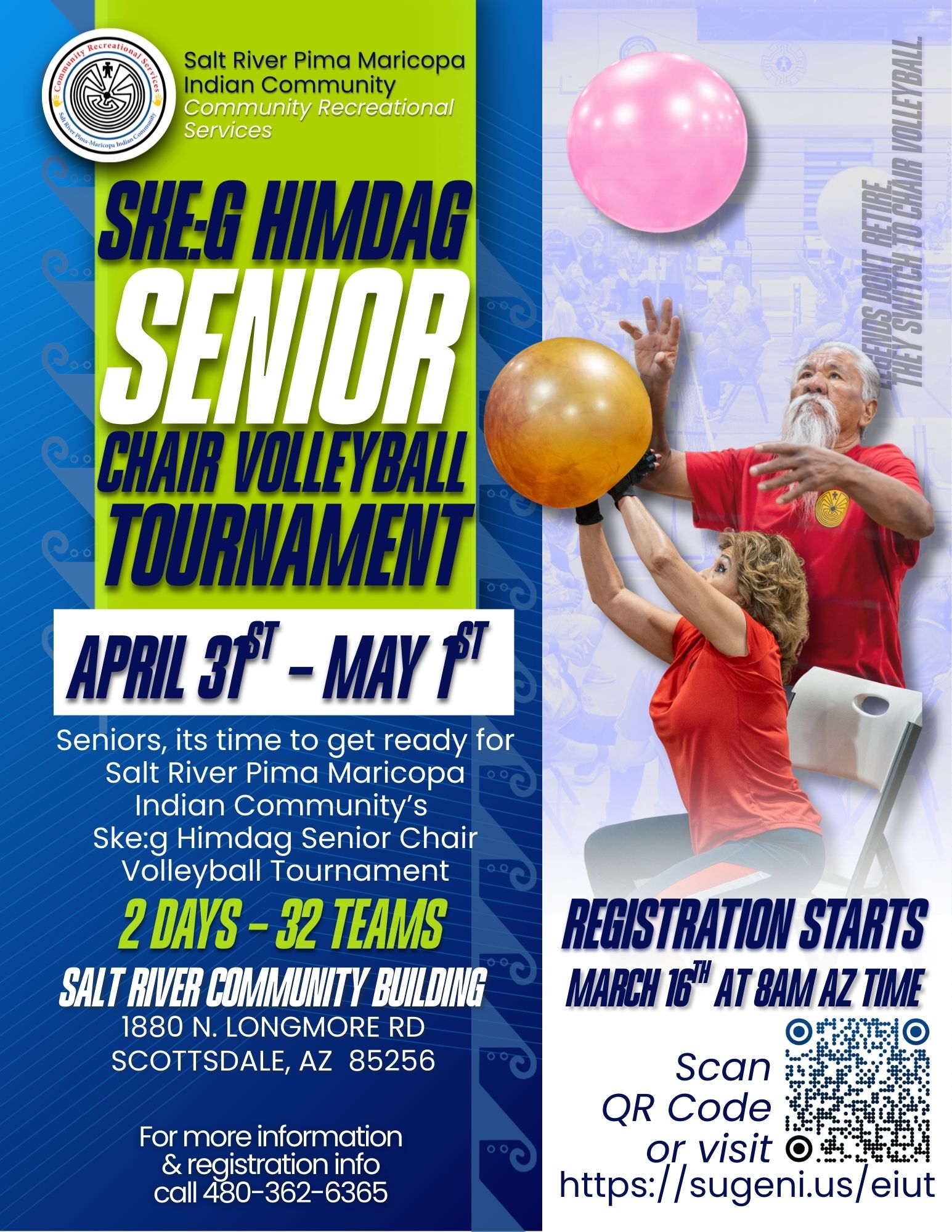 The Salt River Pima-Maricopa Indian Community Ske:g Himdag Senior Chair Volleyball Tournament is back! Join Community Recreational Services for two exciting days of chair volleyball featuring 32 teams competing for fun, teamwork, and friendly competition.