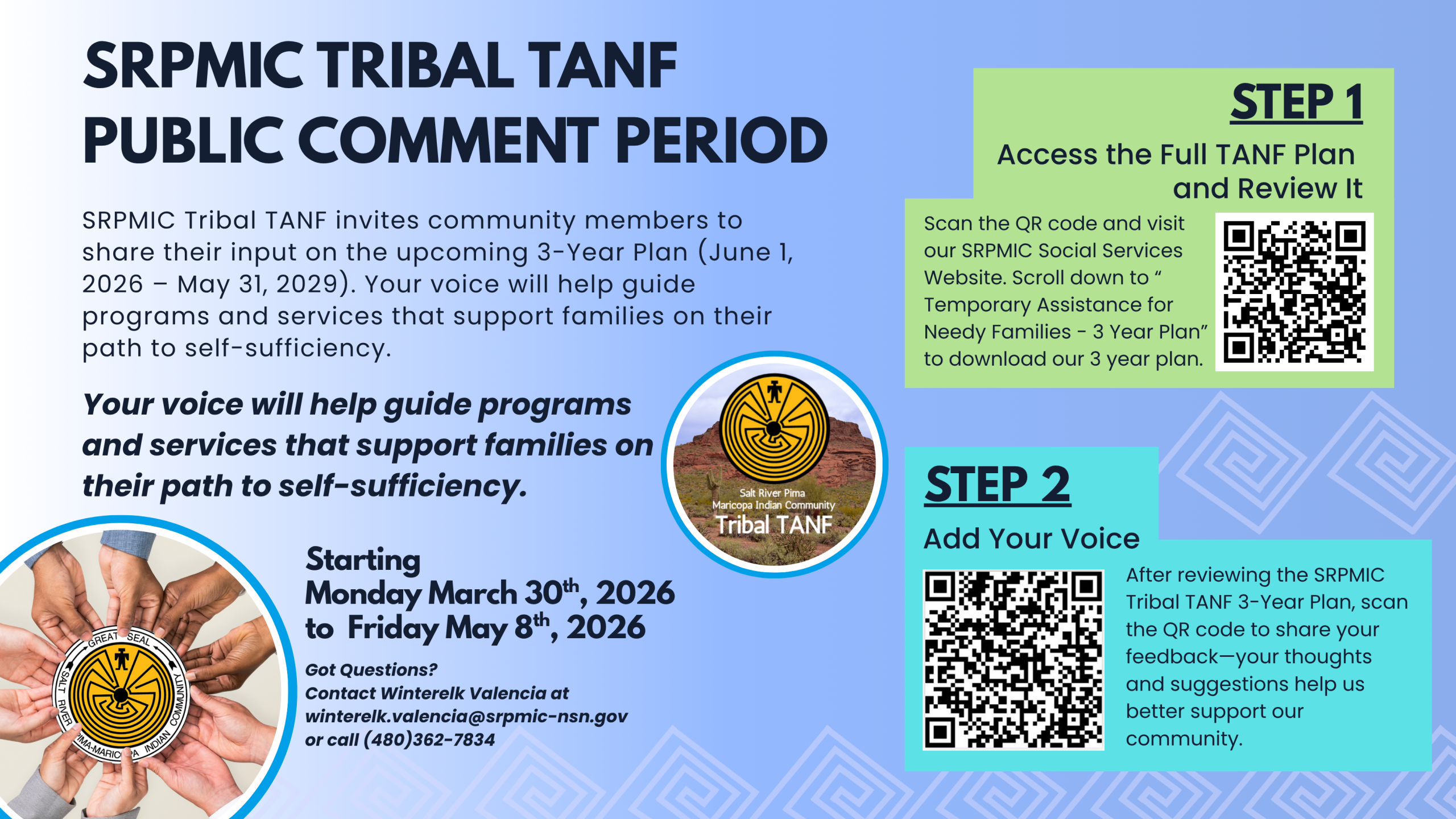 SRPMIC Tribal TANF (Cash Assistance) invites Community members to scan the QR Code, read proposed changes and comment, email or contact us. Our Three Year plan is a formal plan covering a 3-year period that explains: