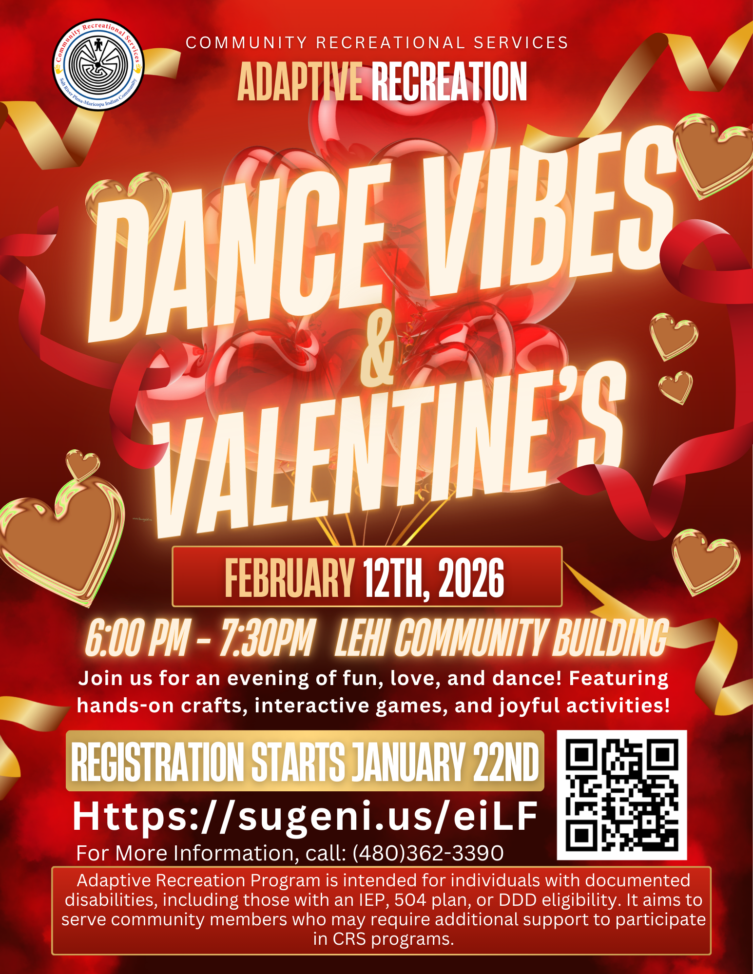Join Community Recreational Services Adaptive Recreation for Dance Vibes & Valentine’s, a feel-good night full of music, movement, and Valentine’s fun. This inclusive event welcomes participants of all abilities and celebrates connection, creativity, and joy in a supportive environment. Participants will dance the night away while enjoying hands-on crafts, interactive games, and joyful activities that celebrate friendship, love, and great vibes.